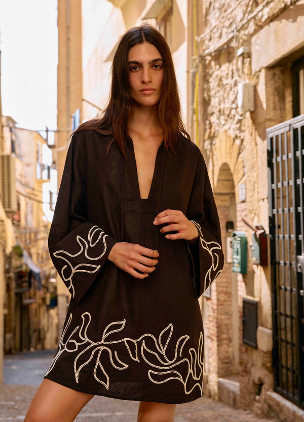 Sitting within this story, this design is a modern vintage-inspired embroidery in cream, perfectly paired with a chocolate linen blend. Each embroidery detail has been thoughtfully crafted to enhance the easy yet sophisticated silhouettes it embellishes.